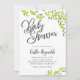 Cute lemon theme baby shower invitation card featuring hand painted illustration of yellow lemons and flowers on a green tree branch. Perfect for a gender neutral summer shower.