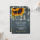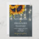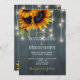 Elegant chic summer or autumn fall wedding stylish invitation template on navy blue chalkboard featuring a beautiful sunflowers bouquet and vertical stings or twinkle lights. Fill in your information in the spots, You can choose to customize it further changing fonts and colours of lettering. --------- The invitation is suitable for elegant summer or autumn fall rustic country | garden backyard weddings. -- If you need assistance in customizing it, please contact me!