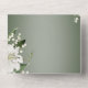 AVAILABLE WITH OR WITHOUT A QR CODE OR DINNER SELECTION OPTIONS. This wedding invitation features a visually captivating design, starting with a dark sage green background that sets an elegant and sophisticated tone. Overlaid on this background is a subtle white blur, adding a touch of softness and depth to the overall appearance. Encircling the invitation is a delicate gold oval frame composed of white lilies and lily of the valley flowers. These graceful blooms are intricately detailed, showcasing their natural beauty and representing purity and new beginnings. The lilies and lily of the valley flowers intertwine with lush greenery, creating an enchanting frame that exudes a sense of romance and charm.