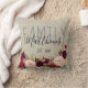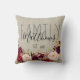 Personalized rustic family keepsake pillow with burgundy floral watercolor design, grey FAMILY hand lettered script with married last name and established date in black script font typography overlay printed on a printed beige linen background. Makes a great wedding gift for newlyweds or family gift. Great for your bedroom, favourite chair, as fun decor in your family room or formal decorative addition to your living room as a cherished family memento