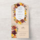 Elements: vibrant fall florals against a pale peach background. Classic serif fonts. Colours: marsala, orange, burnt sienna, plum, green, peach. Themes: rustic, fall, autumn, boho, bohemian, country, vintage. Collection: Rustic Marsala Burnt Orange Fall Wreath Wedding Collection. Product Type: All-In-One Wedding Invitations