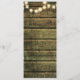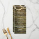 Rustic wood wedding dinner menu and string of lights. The menu is part of a wedding invitation set