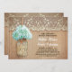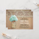 Cute rustic rehearsal diner invitation featuring mason jar with turquoise hydrangea blossom. Perfect invite for country rehearsal dinner with vintage lace and distressed wood accents.