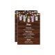 A rustic wood textured wedding menu with floral hydrangea mason jars and string of lights. This menu is part of a wedding invitation set.