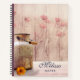 A spiral notebook with a rustic country design. An old rusting milk can with a pretty orange flower. Wheat and faded red poppies in the background set against a faint wood panel.