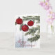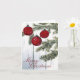 An elegantly designed card of rustic red ornaments decorating a tree with a white shiplap background. Original artistry hand-painted in watercolor.