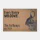 This simple, minimal and rustic modern black bunny rabbit entryway welcome mat is an easy way to greet everyone coming to your home or business! The words "Every Bunny Welcome," your last name or business name, and the established date are all customizable to your liking.