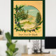A vintage rustic image; a circular vignette featuring mountains and conifer trees with snow in the branches surrounded by a floral motif. Add your own text.