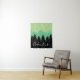Rustic forest trees silhouette and mountains wall tapestry with the word "adventure" in white script.