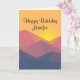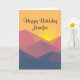 Birthday card with a graphic illustration featuring many mountain tops with bright yellow sunlight setting behind the mountains. Made with geometric polygonal shapes.Simple minimalist design. Colours range from dark blue to desert red.