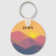 A keychain with a graphic illustration featuring many mountain tops with bright yellow sunlight setting behind the mountains. Made with geometric polygonal shapes.Simple minimalist design. Colours range from dark blue to desert red.