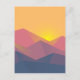 A postcard with a graphic illustration featuring many mountain tops with bright yellow sunlight setting behind the mountains. Made with geometric polygonal shapes.Simple minimalist design. Colours range from dark blue to desert red.