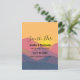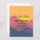 Save the date wedding postcard with a graphic illustration featuring many mountain tops with bright yellow sunlight setting behind the mountains. Made with geometric polygonal shapes.Simple minimalist design. Colours range from dark blue to desert red.