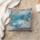A nautical theme wedding pillow featuring an ocean with rustic wood and an anchor and heart shaped knot tied rope.