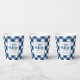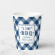 "I do" BBQ wedding paper party cups feature a rustic navy blue and white gingham tablecloth plaid patterned background with custom text for the bride and groom couple's first names that can be personalized. Perfect for a casual summer backyard wedding event.