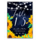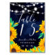 Rustic navy wood string lights sunflowers table number
