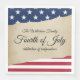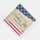 These custom party napkins feature a patriotic Fourth of July theme. The background is a rustic looking, faded parchment paper design with elegant script font that resembles the Declaration of Independence document. The top portion has a border of white stars over a navy blue banner, with red and white stripes placed along the bottom portion to represent the American flag. They're perfect for an intimate 4th of July celebration, or a grand party.
