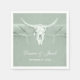 Rustic pastel sage green white bull cow skull country western cowboy wedding reception paper cocktail napkins. Vintage farmhouse inspired printed distressed texture. Old wild west antique style. Cool, trendy, modern farm animal design. Personalize your script. Image copyright Marg Seregelyi Photography.