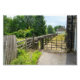 A rustic and inviting path in Mytholmroyd, Calderdale, West Yorkshire, framed by a wooden fence on the left and a traditional metal gate on the right, leading towards the hidden Hawksclough Bridge. The path is partially overgrown with green grass and wildflowers, indicating a less trodden, natural route. In the background, the dense, vibrant green foliage of trees and bushes characterizes the Pennine landscape. A glimpse of a traditional stone building and a white fence can be seen further along, hinting at the peaceful rural setting. The scene evokes a sense of discovery and the charm of the English countryside. This image can be edited and transferred to multiple products of your choosing.