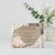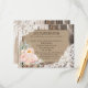 Peony floral bouquet over burlap-look pattern, white chantilly lace, and barn wood background rustic wedding accommodations card.