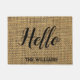 Welcome your guests with this rustic burlap background door mat with your family name and a black typography "hello".