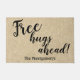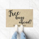 Welcome your guests with this fun script typography rustic door mat design personalized with a name and "Free hugs ahead" message. Fill in the text field with a family name, remove the name or click customize to select a font style, size, and colour you prefer.