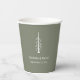 Casual sage green wedding reception paper cups, with a pine tree and customizable typography design. A rustic addition to your wedding reception refreshments.