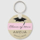 Modern Rustic Pink Class of Graduation Keychain with a graduate name, school name, class year and black graduation cap. Pink stripe on beige rustic background. Personalize the keychain and make a great personalized gift and keepsake for a graduate.