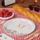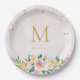 Bridal party paper plates featuring elegant rustic pink floral bouquet with personalized initial.