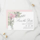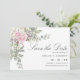 Elegant and traditional save the date design features blush pink roses nestled in sage green leaves. Save the Date is written in a beautiful script font. The remainder of the text is a classic serif font. Its soft grey colour blends well with the botanical elements. All of the text can be easily edited. The card back is blush pink.