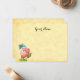 Beautiful, rustic 4.25x5.5 note cards with editable script letters and vintage botanical art of a pink rose and a blue butterfly on a faux parchment background.