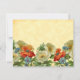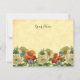 Elegant, editable note cards with script letters in dark brown with a bottom border of orange and white poppy flowers and blue cornflowers, front and back on a rustic faux-canvas background.