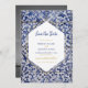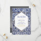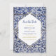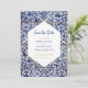 This design features rustic Portuguese tile patterns with your own custom photo on the reverse of the card. The wedding text is elegantly framed with a white and gold colour geometric shape. Unique Azulejo blue and white floral wedding photo save the date card design with modern elements. Matching wedding invitations and other stationery items are also available.