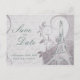 Swirls billow and curl about a dark teal green sienna hand-drawn Eiffel Tower against lavish, floral purple damask pattern. A French love poem is faintly inscribed in the silver background, providing the perfect accompaniment to the customizable save the date wording in script and engraving style fonts.