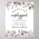 Watercolor purple roses along with greenery and dangles create a beautiful modern floral unplugged wedding sign. Unplugged and the wedding couple's names are written in a flowing script font. The remainder is written in a classic serif font. All of the text is editable.