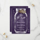 Rustic purple wedding save the date card featuring a mason jar and burlap hearts against a barn wood background adorned with twinkle lights. Easily personalize this cute rustic purple wedding save the date online. Matching items available to complement this purple wedding save the date.