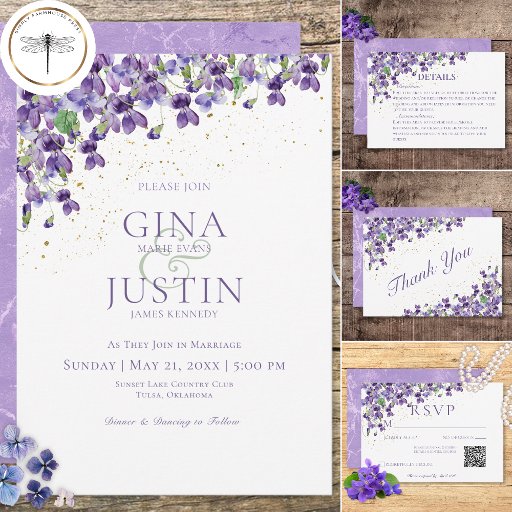 ALSO AVAILABLE WITH A QR CODE TO SCAN. Invite your guests to a celebration bathed in ethereal elegance. Our watercolor wedding invitation features a cluster of delicate violets, hand-painted in the softest shade of violet, adorning the top corner. A touch of ethereal magic is added with a sprinkling of faux gold dust shimmering amongst the blooms. The pure white background allows your text, also a soft violet, to stand out beautifully. This enchanting suite creates a timeless and romantic atmosphere, perfectly reflecting the beginning of your forever. Created by Simply Farmhouse Press.
