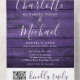 All in one wedding invitation with pretty string lights, signature style names and chic typography on a rustic purple wood background. The invitation includes a perforated RSVP card with your wedding website QR code and Details. Designed by Thisisnotme©