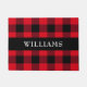 This lumberjack style red and black buffalo check pattern doormat has a black strip across the centre with a family name in white text. Personalize with your own name or to give as a gift.