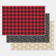 Rustic modern gift wrap set features three coordinating holiday wrapping paper sheets: bright red and black buffalo plaid, black with white script "Merry Christmas" text, and kraft tan brown with white winter snowflakes pattern.