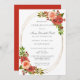 Soft red roses join with coral pink roses to create an elegant fall celebration of life memorial invitation. The warm Autumn colours look beautiful nestled in red berries, red wildflowers and deep green foliage. The oval gold frame adds a pretty touch. The back of the invitation is a deep red