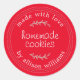 The Rustic Red Homemade Cookies Label is a round sticker featuring a bright red background, soft white lettering, and stitched rustic border details. Perfect for homemade cookies, baked treats, party favours, and small-batch kitchen goods, this label adds a warm, personal touch to your packaging. The “made with love” message and customizable name line make it ideal for craft fairs, gifts, and home baker branding.