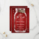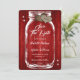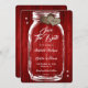 Rustic red wedding save the date card featuring a mason jar and burlap hearts against a barn wood background adorned with twinkle lights. Easily personalize this cute rustic red wedding save the date online. Matching items available to complement this red wedding save the date.