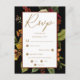 Ethereal floral bouquets with shades of dark red, rusty orange, yellow to harvest gold and lush greenery give this dark botanical wedding response "RSVP" design a look of deep, rich modern rustic elegance that is sure to impress your recipients. Available in a variety of colour combinations. Simply add your response date. Shown here on a black background. Composite design by Holiday Hearts Designs (rights reserved).