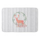 A bath mat with a cool boho style digital watercolor design. A pastel orange reindeer silhouette inside a wreath of herbal leaves. Mushrooms and forest ferns at his feet.