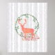 A poster with a digital watercolor design. A pastel orange reindeer silhouette inside a wreath of herbal leaves. Mushrooms and forest ferns at his feet. A grey and white birch tree pattern in the background.