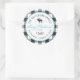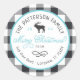 Affordable custom printed round return address stickers personalized with your family name, the year and your return address. This fun design features a buffalo check plaid background, reindeer graphic and modern rustic typography in aqua, white and charcoal grey colours. The text reads "Merry Christmas" in a trendy script font. Use the design tools to edit text fonts and colours to further customize your own unique holiday return address labels.