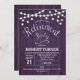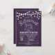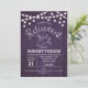 Rustic retirement party invitation with purple wood pattern. Features string fairy lights and script font. Perfect for a country or western style party.