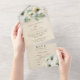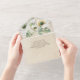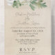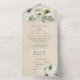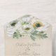 This vintage style romantic floral wedding invitation features an all-in-one design with an R.S.V.P. card included at the bottom. The background is a rustic parchment paper design that resembles an old vintage book, with watercolor ranunculus flowers. A delicate bouquet of ranunculus and greenery is pictured on the front flap, and two on the inside portion.