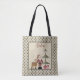 Rustic Santa Claus and his adorable Reindeer are standing next to a snow covered tree that they put presents under. Snowflakes are fluttering all about. The outside edge of this tote bag is a tan plaid pattern with little green Christmas trees all over. Personalize it inside the centre with your name. Design on reverse side is the same.